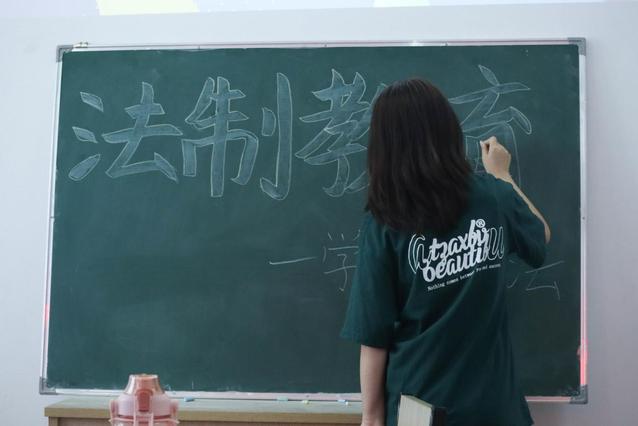 (图为团队队员吴彤在设计“法制教育”主题黑板报)