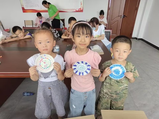 (图为孩子们展示自己画的青花瓷纹饰作品)