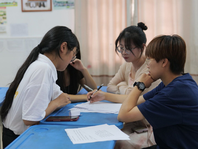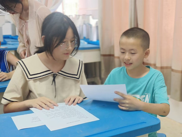 (图为志愿者辅导学生进行朗读稿的准备。通讯员 覃雨欣 摄)