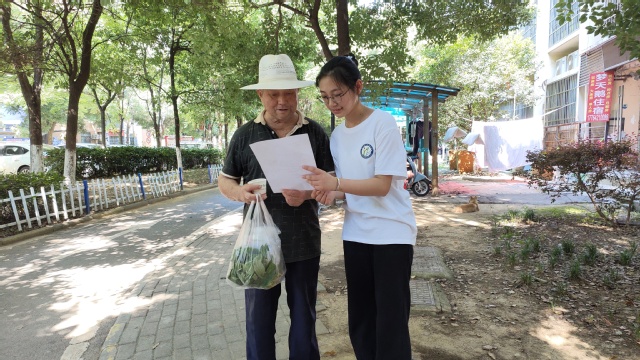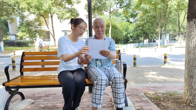 (图为志愿者带领爷爷做生活满意度的调查问卷)