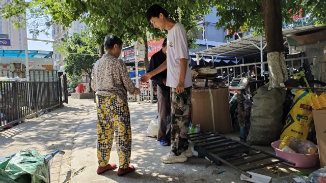 (图为青年在废品回收站帮奶奶卖纸壳)