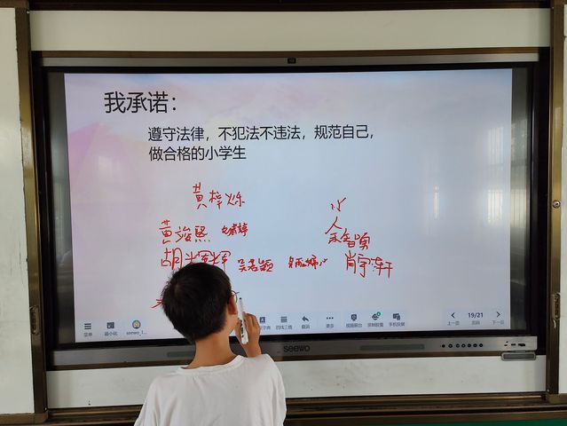 课上,志愿者先向学生们普及“法”的定义及一些违法案例让学生们了解遵纪守法的重要性,并为学生们介绍了一些公民的基本责任与义务和一些与青少年相关的法律条文,让学生们初步了解了法律。在课堂结束之际,为了帮助学生们坚定遵守法律的决心,志愿者还让学生们进行宣誓承诺并在承诺书上签字,写下小便签贴在教室后面进行共勉。本次课程帮助学生们保护自己的安全与权益,促进学生们成为一个遵纪守法的人,为社会进步添砖加瓦。