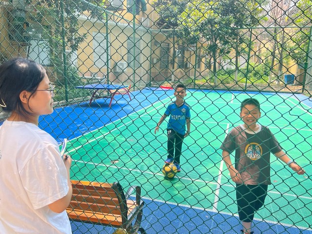 (图为小队成员发现正在踢球的儿童,向他们宣传预防疾病的知识,并且提醒他们外出游玩人多的时候要带好口罩。通讯员 湛欣研 供图)