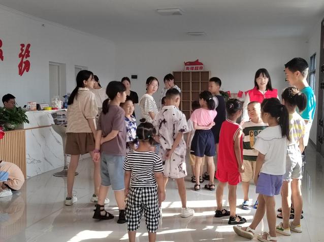 (图为小朋友们集合听着志愿者发布劳动任务)