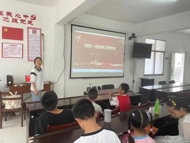 在主题班会上,志愿者通过PPT简要从两弹一星精神内涵、现实意义、两弹元勋历史事迹等方面,帮助孩子们了解“两弹一星”精神,学习“两弹一星”的相关知识。以钱学森院士“坚定从美国回故乡助力中国科技事业发展”的故事引入,通过讲述老一辈科学家扎根戈壁沙漠,干惊天动地事,做隐姓埋名人的先进事迹,使小朋友们被各个时期老一辈科学家们“能吃苦、勇攻关、敢创新、讲协作”的科学态度所鼓舞,更为“两弹一星”元勋和背后默默打拼的无名英雄的爱国精神所打动。同学们听的都很认真,也从宣讲课堂中获得了许多知识和感悟。