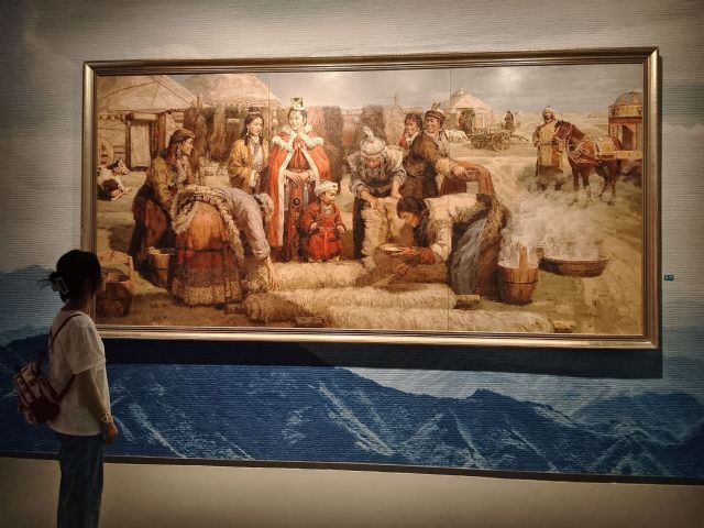 (图为志愿者仔细观看昭君来到匈奴地域与匈奴人和谐相处的图像)