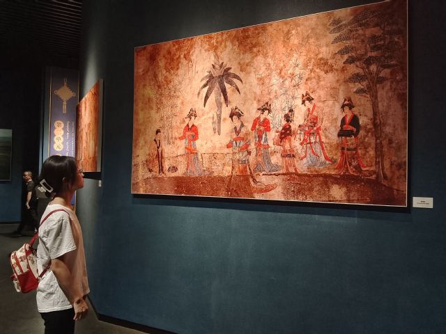 (图为志愿者在内蒙古博物院内参观复制的书画作品)
