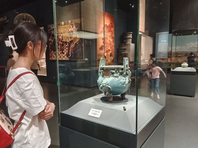 (图为志愿者参观内蒙古博物院内展出的钧窑香炉)