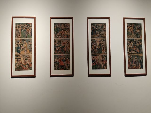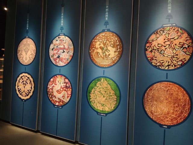 (图为内蒙古博物院内展出的不同时代的丝织品图案)