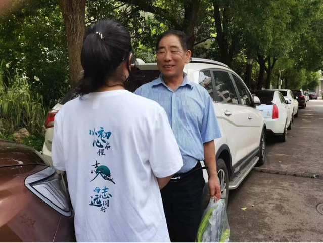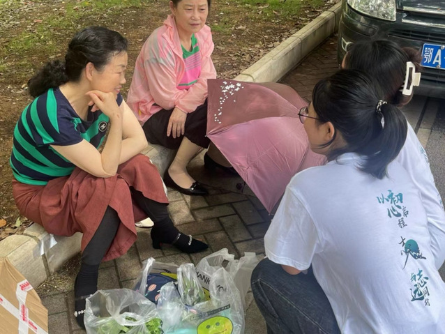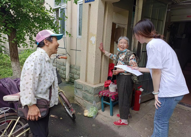 (图为团队成员与路上遇到的买菜回家途中的老人愉快的聊天,询问老人目前生活是否愉快,儿女是否经常回家来陪伴自己,老人很高兴地和我们分享他的生活。心理状态十分不错。通讯员 王丽思 供图)