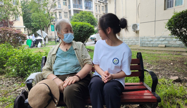 (图为志远团队成员发现老人独自坐在椅子上便过去与之聊天。通讯员 曾思迪 供图)