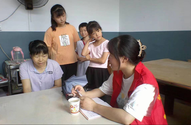 (图为“蓓蕾”志愿服务队队员向学生家长询问家庭状况并认真记录)