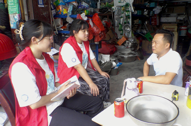 (图为“蓓蕾”志愿服务队队员正在与学生家长进行走访调查)