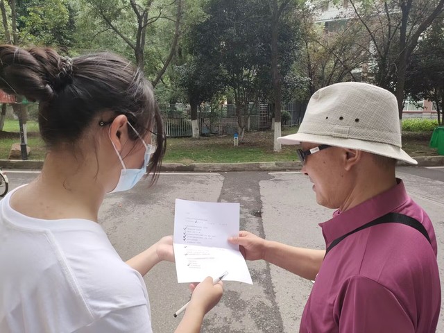 (图为志愿服务队成员在社区居民活动广场附近采访,关于社区老年服务工作在群众心中的感受。通讯员 刘璐 摄)