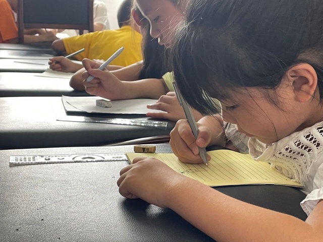 (图为下课前学生们在本子上按照志愿者所讲的要求与方法亲自动手绘画。通讯员 肖庆琳 摄)