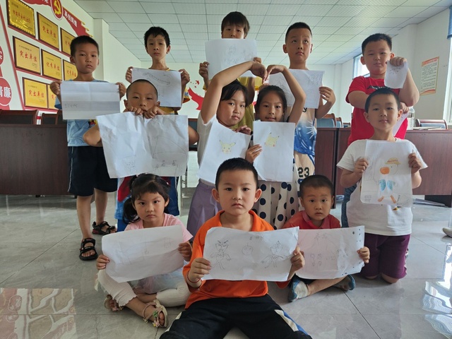 (图为孩子们在绘画课结束后拿着自己的绘画作品一起合影留念。通讯员 刘兆桐 摄)