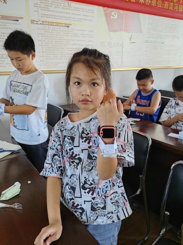 (图为小朋友用真实电话手表与折纸手表作对比。通讯员 孙竹清 摄)