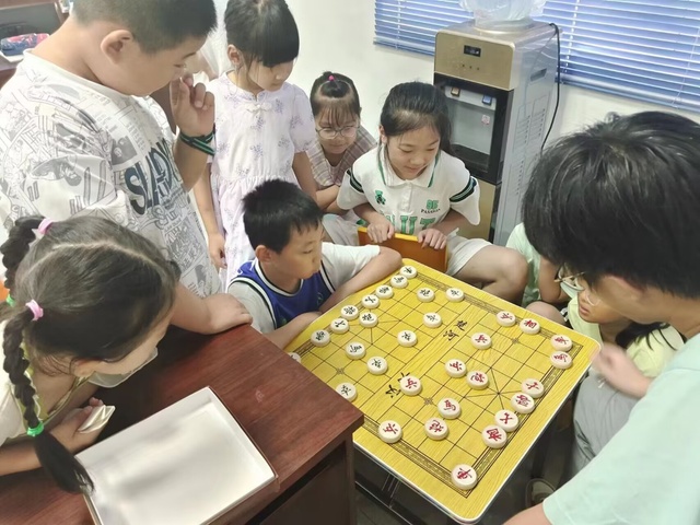 (图为支教队员在课休时与孩子们互动下棋,引来许多孩子的围观、思考和讨论。通讯员 肖述洋)