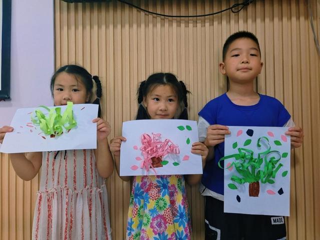 (图为小朋友们展示自己的贴纸画)