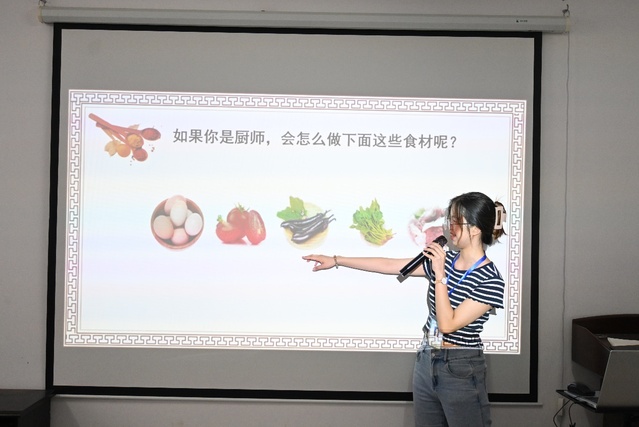 (图为学生们积极回答志愿者老师提出来的有关处理菜肴的问题)