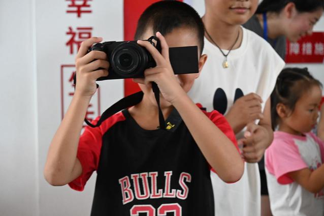 (图为孩子们拿起志愿者老师的相机拍摄属于自己的摄影作品。通讯员 付渝彤 摄)