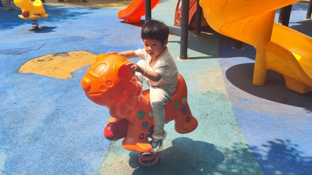 (图为小朋友满心欢喜骑上木马)
