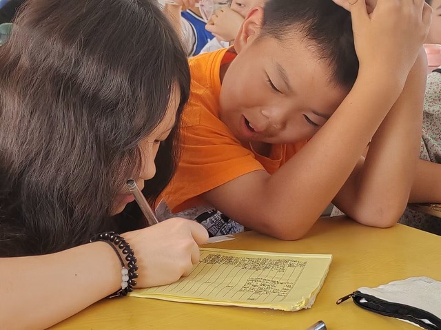 (图为志愿者教小朋友暑假作业中不会的题目,小朋友瞬间恍然大悟)