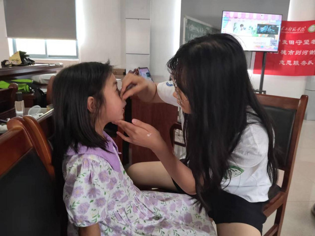 (图为志愿者老师给小孩子为接下来的才艺表演做准备)