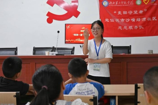 本网讯(通讯员 雷晴)为传递爱国主题的价值观念和文化,培养学生的爱国情怀和责任意识,8月上旬,我校赴仙桃市“麦田守望者”志愿服务队在通海口镇共和村党群活动中心开展了系列爱国主义支教活动。服务队采取多种教学方法,其中包括课堂教学、互动游戏、手工制作和小组讨论等,针对不同年级的孩子们设计不同的教学内容,从民族、党史、文化、防治结核等方面展开教育,让学生了解祖国悠久的历史和丰富文化,培养对祖国的热爱和自豪感。