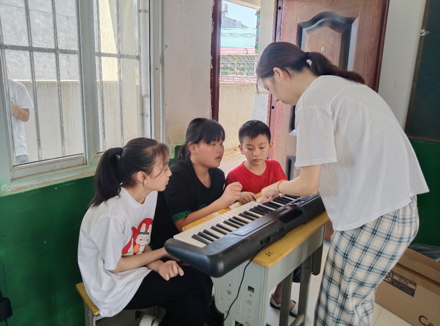 (图为学生跟随志愿者的指导,弹奏电子琴,奏出美妙的音乐,感受到音乐的魅力。)