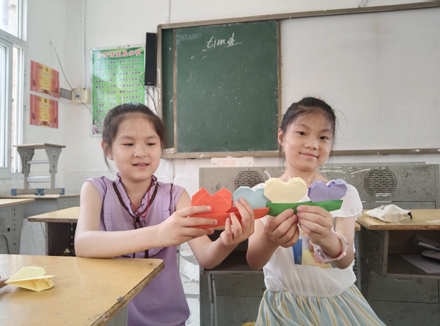 (图为学生在志愿者的指导下,折出了各种精美的纸艺作品并展示。)