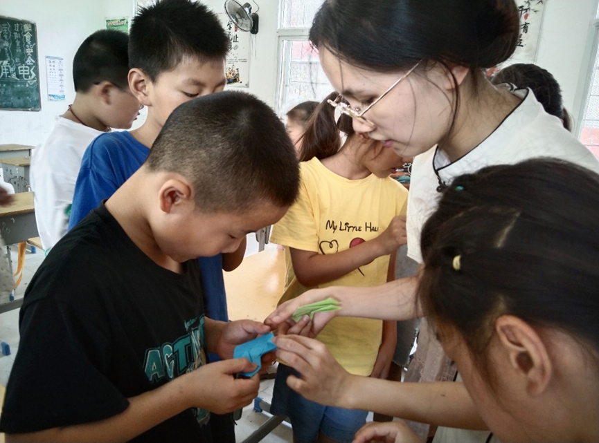 (图为志愿者悉心指导学生折纸重的困难步骤。)