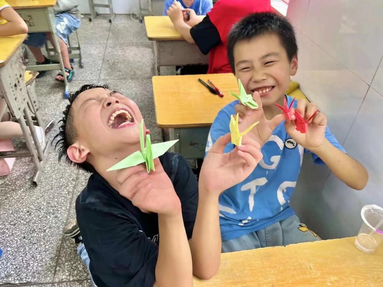 (图为手工折纸课上小朋友们高兴的展示着他们所折的小兔子和千纸鹤。通讯员 谷玉婷 供图)