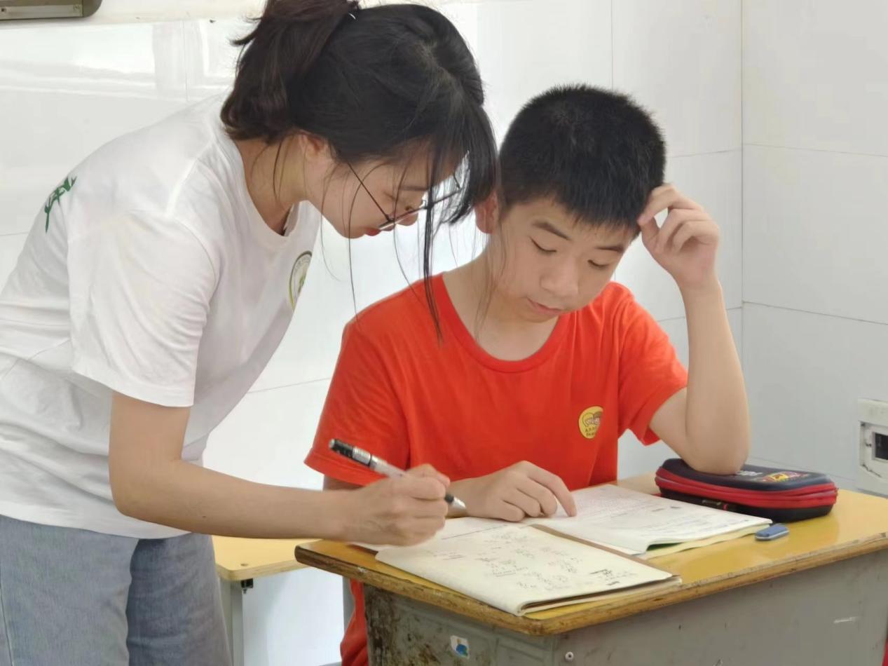 (图为志愿者老师在帮助小朋友解决暑假作业上的难题,在短暂的暑假期间帮助小朋友们巩固以前学习到的知识。通讯员 蒋倩 供图)
