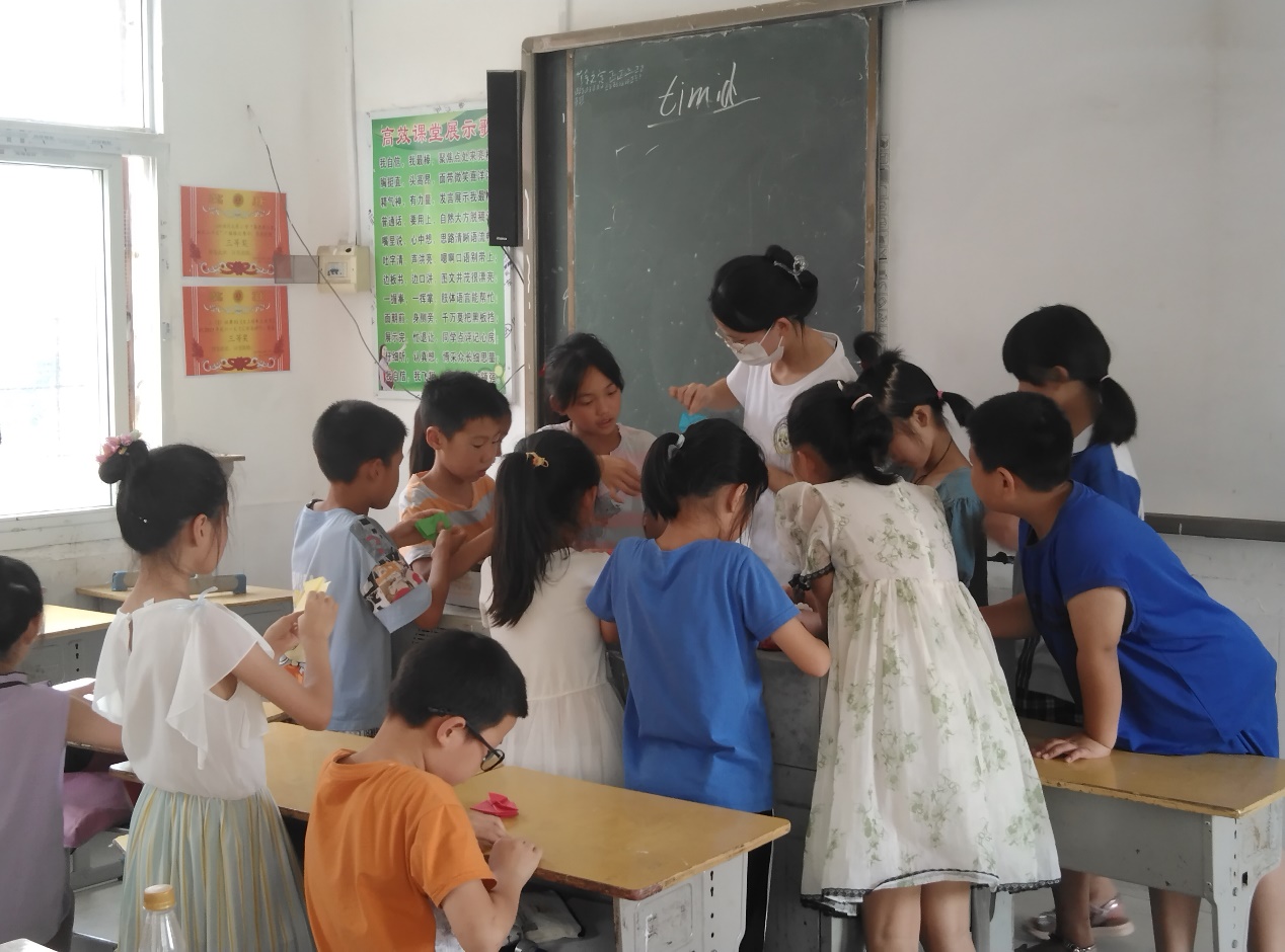 (图为折纸课上学生提问疑难问题,志愿者悉心解答。)