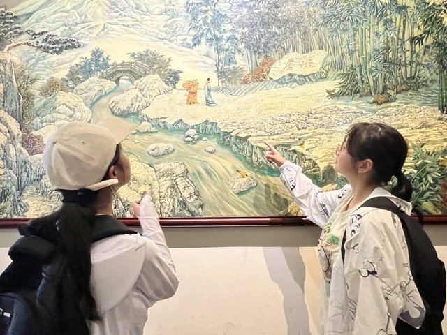 (图为实践队员观看、讨论滕王阁内乙烯壁画,体会其中清新飘逸意境。通讯员 宋涵 摄)