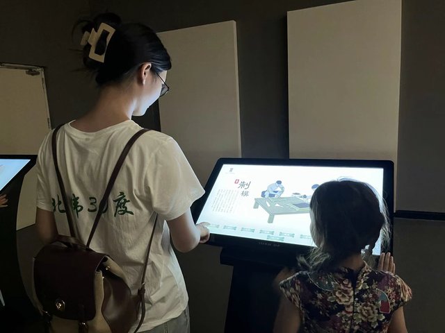 (图为实践队员引导小朋友一起利用多媒体观看制模过程。通讯员 宋涵 摄)