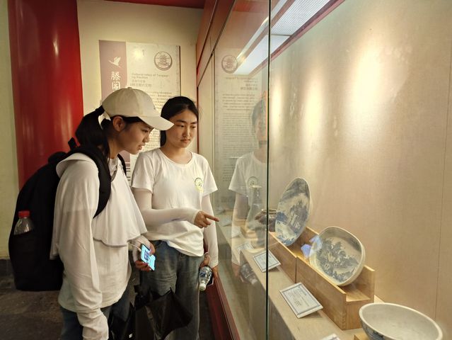 (图为实践队员欣赏景德镇瓷器,青花色淡典雅,展现了南昌的民俗风情。通讯员 宋涵 摄)