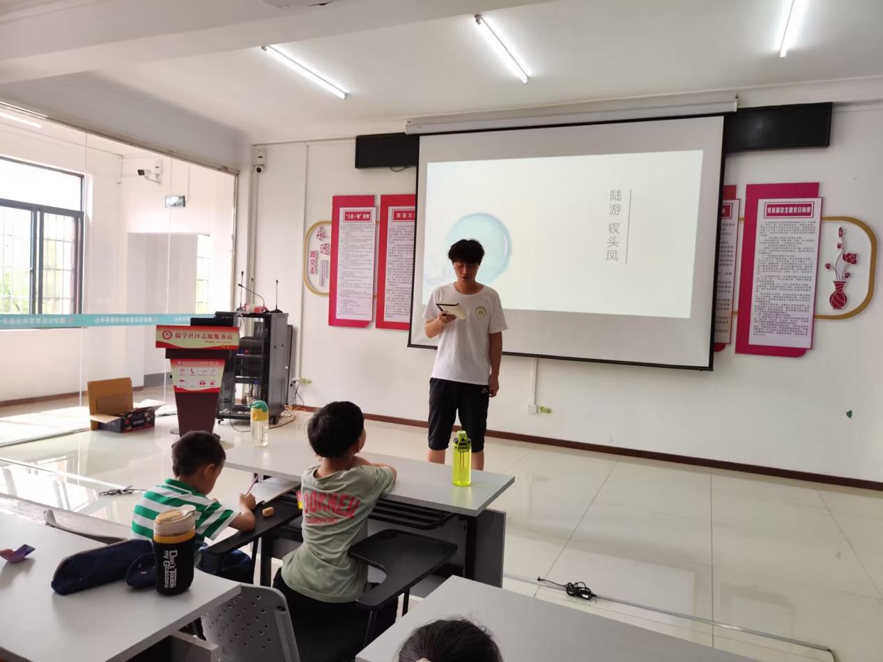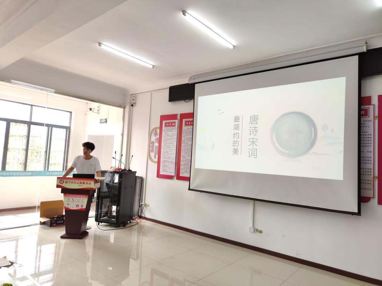 本网讯(通讯员 杨启帆)2023年7月23日,鄂州市儒学社区——我校赴鄂州“北纬30度·寻粹社会实践队”的支教第十分队大学生志愿者为社区儿童开展了一场丰富欢快的唐诗宋词讲堂。作为中华民族灿烂文化的重要组成部分,唐诗宋词承载了中华民族的智慧和情感,大学生志愿者们希望通过开展唐诗宋词文化讲堂,将这些经典之作介绍给社区的儿童,帮助他们领略其中的美妙和魅力,志愿者们为社区的儿童们讲述了唐诗宋词的背景、培养和值得欣赏的经典作品。讲师采用富有趣味和互动性的方式,引导孩子们通过欣赏、背诵和模仿来进一步理解和感悟诗词的美。他们相信,这样的活动对于孩子们的文化熏陶和综合素养的提升具有重要意义,同时也让家庭更加重视传统文化的传承,也希望通过这次讲堂向社区的儿童传递中华经典文化,并培养他们对传统文化的热爱和理解。