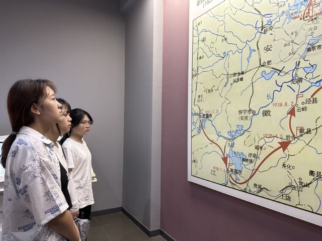 (图为实践队队员正在参观《新四军军部驻地迁移路线图》。通讯员陈谢君 供图)