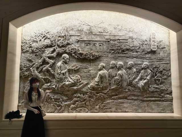 (图为我们队员欣赏浮雕作品 通讯员 蔡文静 摄)