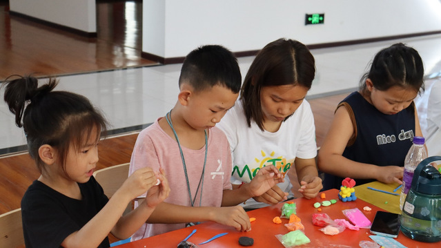 (图为志愿者与孩子们正在认真地完成手工作品)