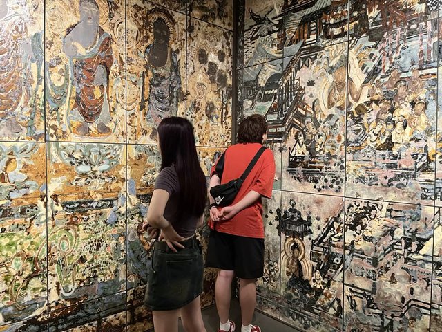 (图为队员欣赏涵盖了尊像画、佛经故事画、经变画、供养人画像等题材内容的敦煌壁画)