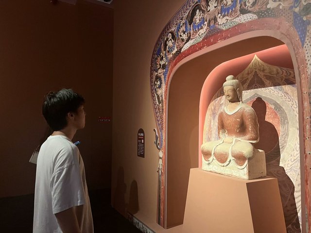 (图为队员正在欣赏来自敦煌的高保真复制藏品禅定佛像)