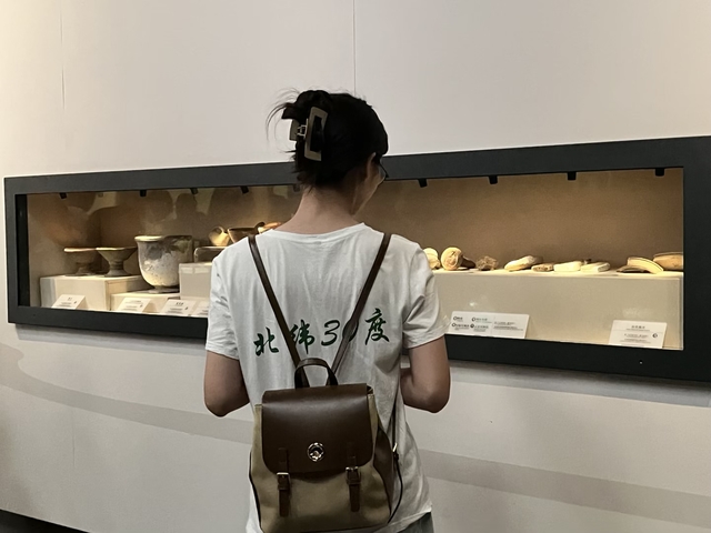 (图为队员正在仔细观看先秦时期江西的陶器创烧历程)