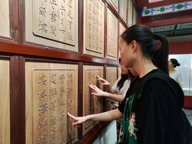 (图为实践队队员在用指间感受清末江西民间木雕的窗板。通讯员王思怡 供图)