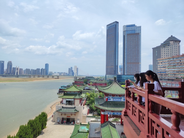 (图为实践队队员在滕王阁上眺望远方的楼宇。通讯员王思怡 供图)