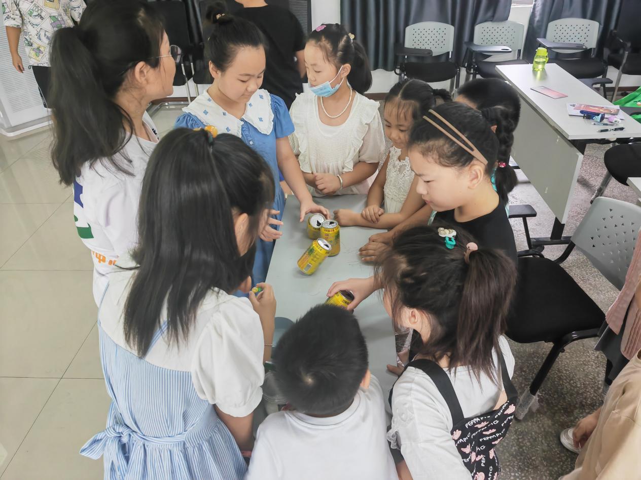 (图为孩子们在进行探索重力可以让易拉罐斜着立起来的实验)