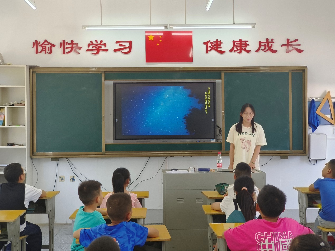 在这个炎热的夏天,蝉鸣声长,我们积极向上,让理想绽放在每一个小朋友心间。我们倾己所知、尽己所能,从德智体美劳五个方面全面发展课堂,让每一节课都变得充满意义。志愿者们内心热情似火,孩子眼睛闪烁光彩。虽然只是短短的三周时间,但这段日子让我受益良多。看着一双双清澈的眼睛,我们站在三尺讲台上责任重大。我负责科学科实验和天文科普等课程。科学实验动手部分永远是孩子们最感兴趣的环节,尽可能的用简易且这个年龄段孩子能懂的话语来解释一些生活中的物理化学知识,结合科学实验视频更加直观的展现实验结果,再让同学们亲自动手去做实验。让他们更好地去记住这个与生活有关的实验结果。有趣的动手实验,让他们对科学抱有更加浓厚的兴趣。