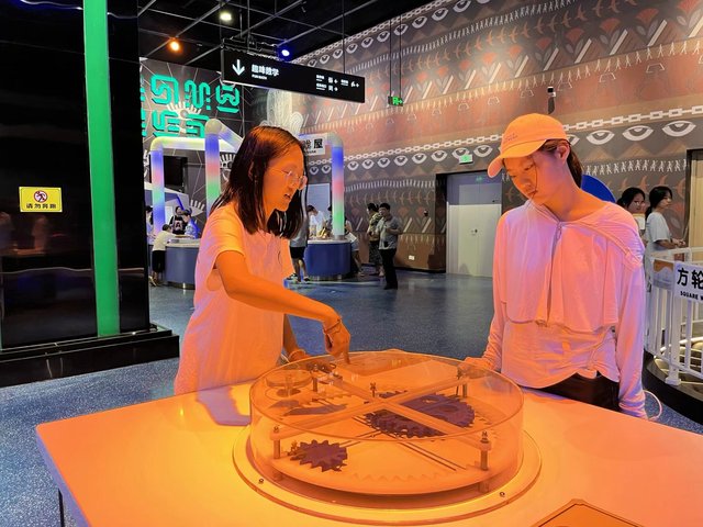 (图为队员们正在利用馆内设置亲身体验科学原理)
